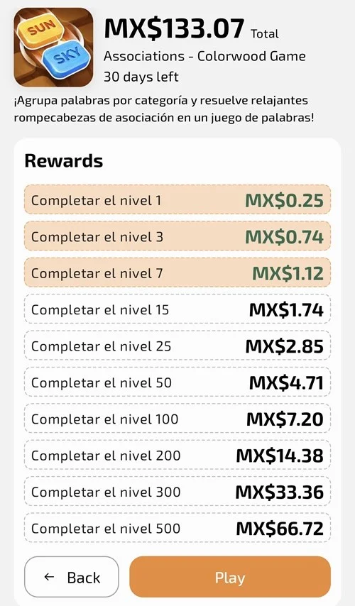 - Ya que has pulsado en algún juego, te van a mostrar lo que tienes que alcanzar en cada juego y cuánto te van a pagar. Por ejemplo, te pueden pagar cada cierto nivel una determinada cantidad. En la siguiente imagen puedes apreciar que ese juego te paga un total de 133.07 pesos, pero para poder ganar todo ese dinero, tienes que ir alcanzando diferentes niveles. En este caso, el nivel uno te otorga 0.25 centavos, el nivel 3 te otorga 0.74 centavos de peso y así sucesivamente.